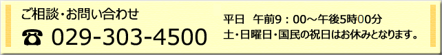 ご相談は029-303-4500まで。平日 午前9:00~午後5時00分 土・日曜日・国民の祝日はお休みとなります。